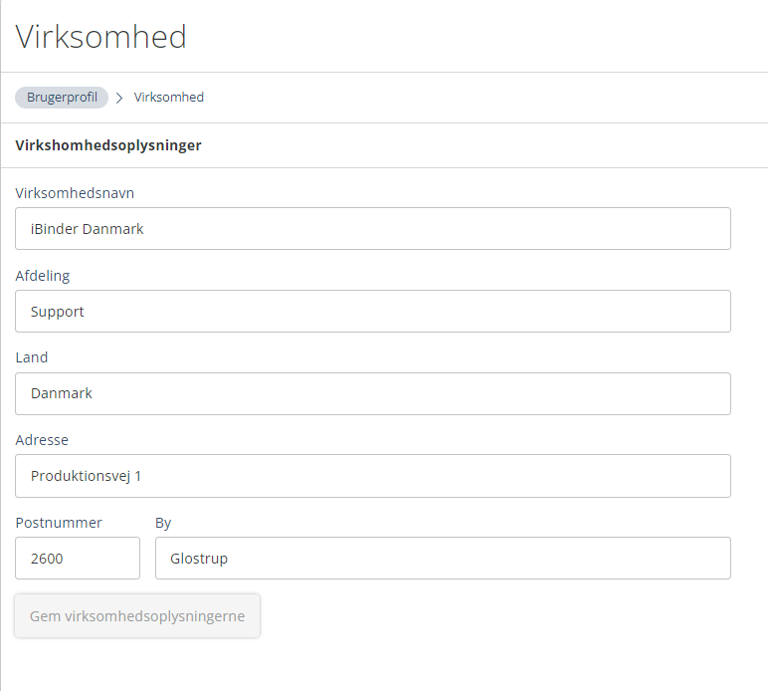 Kan uddybes under fanen "Virksomhed". Her kan du tilføje afdeling, land og adresse.