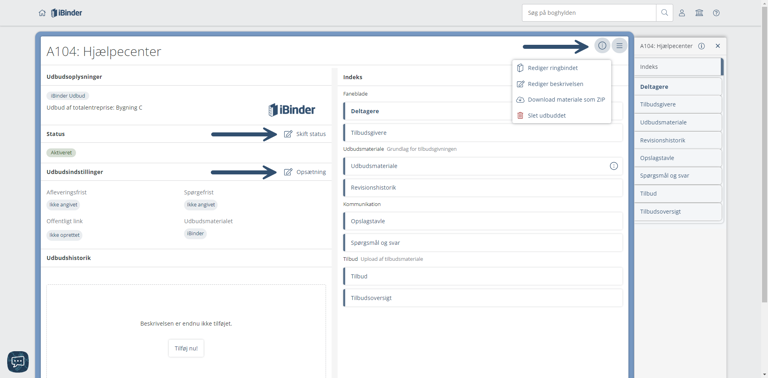 På ringbindets indeksside, kan man ved at klikke på de tre små prikker øverst til højre, tilgå mulighederne for redigering, download og sletning af udbuddet.