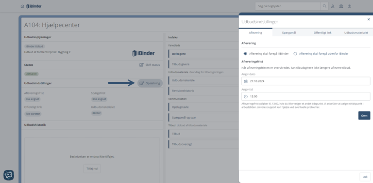 Beslut om afleveringen skal ske indenfor- eller udenfor iBinder. Det er også her du sætter afleveringsfristen.