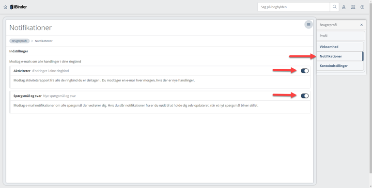 Under fanen "Notifikationer" kan du fjerne eller aktivere notifikationer for aktiviteter, spørgsmål og svar i dine ringbind