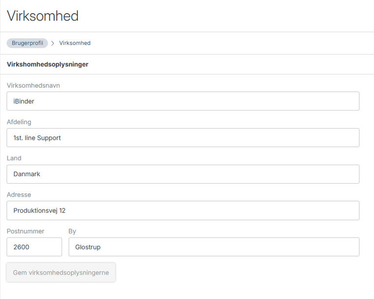 Kan uddybes under fanen "Virksomhed". Her kan du tilføje afdeling, land og adresse.