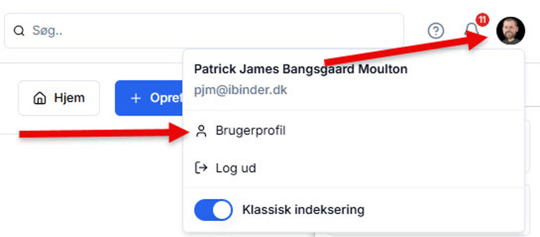 Klik på ikonet som vist nedenfor og dernæst på "Brugerprofil"