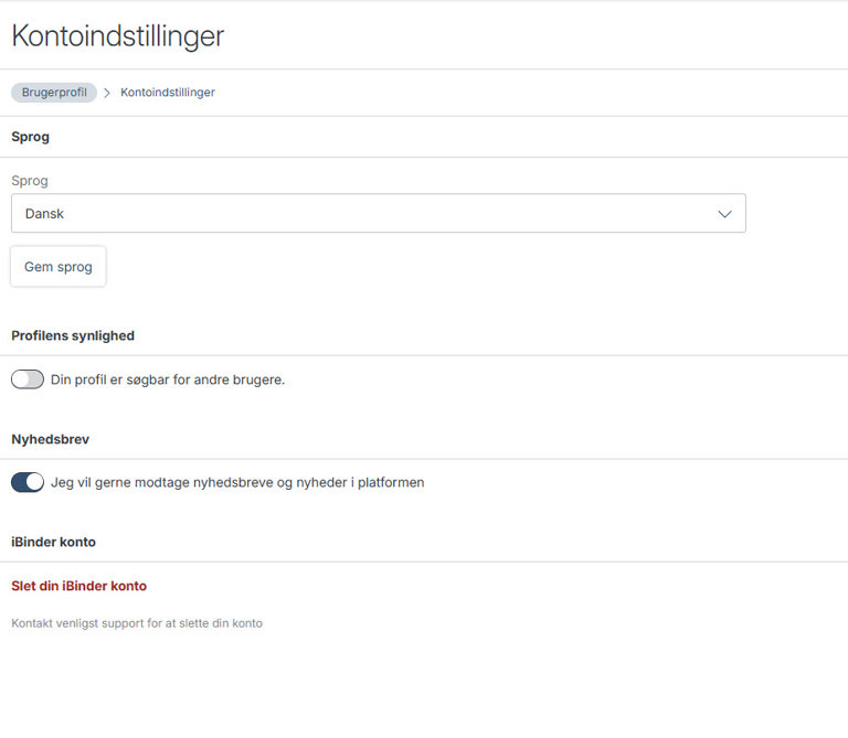 Under fanen "Kontoindstillinger" kan du ændre dit sprog, ændre på søgbarheden for din bruger, samt tilpasse dine præferencer for nyhedsbrev.