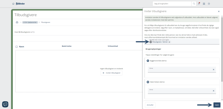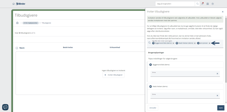 I nedenstående eksempel, fremsøges listen "Tilbudsgivere - Tømrer" i et udbud. Ved at klikke "Tilføj" fremstår de personer, som er tilknyttet listen. Klik gem hvis alle skal inviteres ind, eller dobbeltklik på listen for at fjerne udvalgte personer, ved at klikke på krydset ud for deres navn.