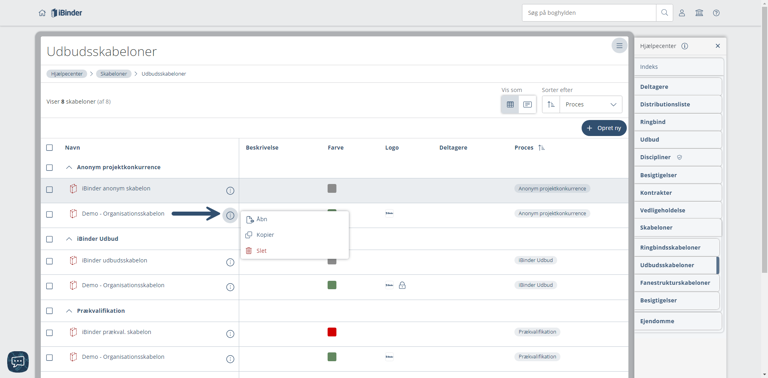 Klik på fanen "Skabeloner" og dernæst "Udbudsskabeloner" for at oprette nye eller redigere eksisterende skabeloner. På listen er skabelonerne kategoriseret efter udbudsprocessen (Læs mere om dem her).
