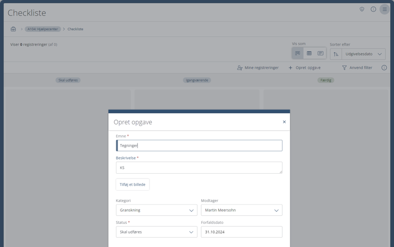 Klik på "+ Opret opgave" og udfyld informationerne i dialog boksen.