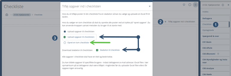 Klik på "Opret en tom checkliste" som set forneden ved den grønne pil og dernæst "Opret ny", for at oprette en tom checkliste.