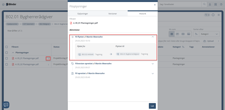 På destinationsfanen hvor filen nu er flyttet eller kopieret til, kan man desuden se hændelsen under "Filoplysninger -> Historik".