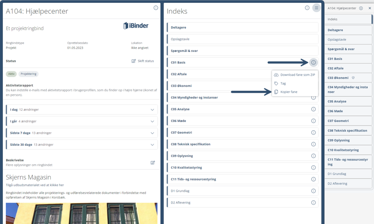 Det er også muligt at kopiere faner eller kun strukturen, enten i gældende eller alle versioner til en anden destination i ringbindet, i organisationen eller i et helt nyt projekt. Dette gøres ved at klikke på de tre små prikker til højre for et fanenavn.