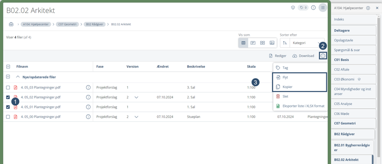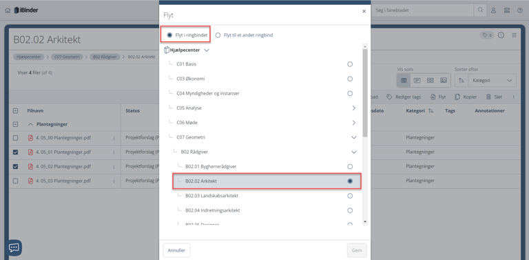 Når du i et ringbind markere en eller flere filer, opstår muligheden for at flytte eller kopiere filer til en anden lokation enten i samme ringbind eller til et andet projekt indenfor samme organisation. Faner kan ikke flyttes, men kan udelukkende kopieres.