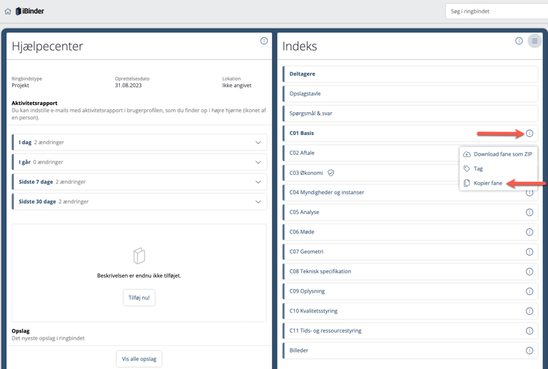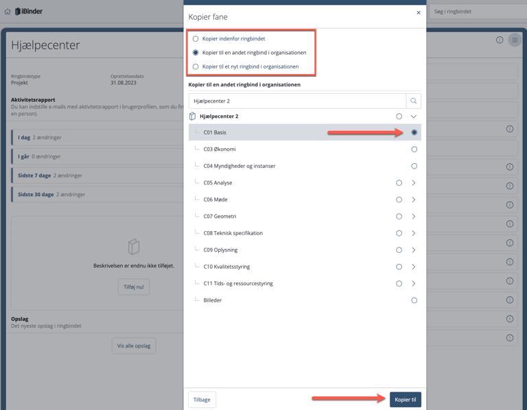 Vælg, hvor kopien af fanen skal hen. Det er muligt at kopiere inden for samme ringbind, til et andet ringbind inden for samme organisation eller til et helt nyt ringbind, som så oprettes i forbindelse med kopieringen. Du kan også vælge, om den nye fane skal være direkte i registreringsdatabasen, eller om den skal ende under en eksisterende fane eller underfane. Klik derefter på "Kopier til":