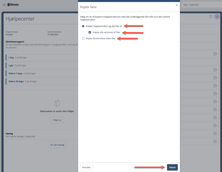 Vælg, om du kun vil kopiere fanestrukturen, eller om du også vil kopiere dokumenterne, og hvis det er tilfældet, om du også vil kopiere alle versioner af dokumenterne: