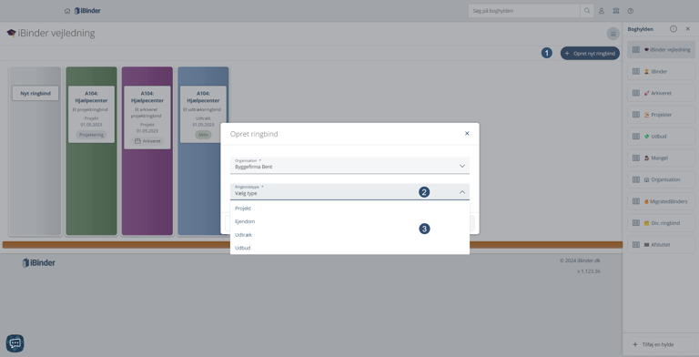 Klik på ”+ Opret nyt ringbind”. Din organisation bør på forhånd være valgt i den øverste drop-down menu. Klik og vælg derefter "Projekt" i dropdown-menuen ”Ringbindstype” inden du klikker på "Næste".