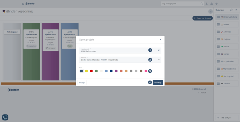Indtast projektnavn. Hvis du er en del af en organisation, kan du i dropdown-menuen vælge en af jeres skabeloner. Vælg en farve og klik "Opret ny".