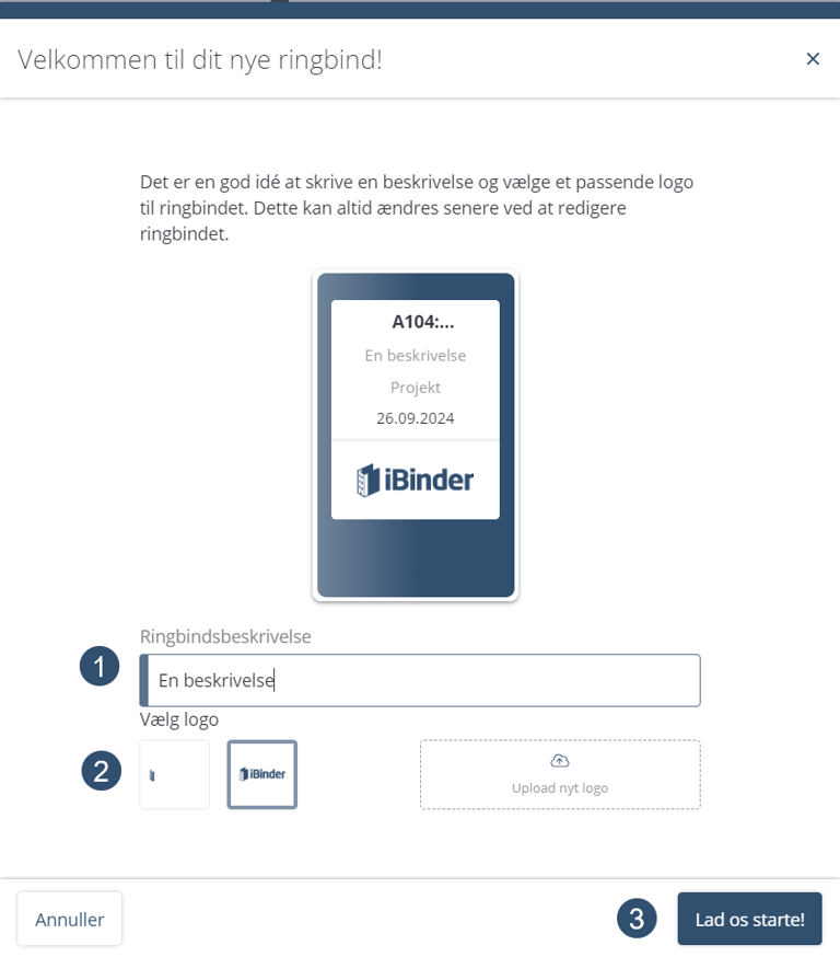 Nu har du mulighed for at udfylde ringbindsbeskrivelsen, som vil blive vist under ringbindets navn. Hvis ringbindet skal have et logo, kan du vælge et eksisterende fra din organisation eller uploade et nyt. Når du er færdig, skal du klikke på "Lad os starte"