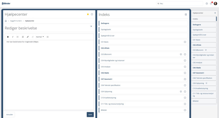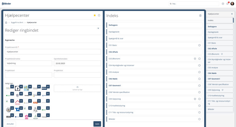 Redigeringstilstanden er nu aktiveret - hvor alt andet end ringbindstypen dybest set kan ændres. Du kan derfor nu ændre projektnavn, projektbeskrivelse, logo, farve, lokation, anlægssum og sprog. Husk at klikke "Gem" når du er færdig.