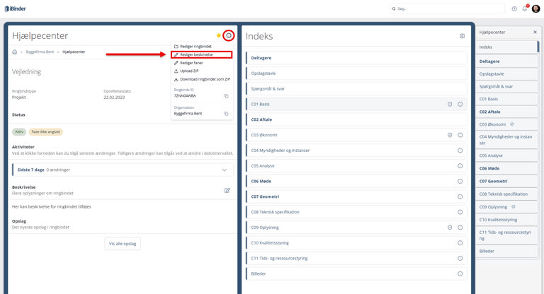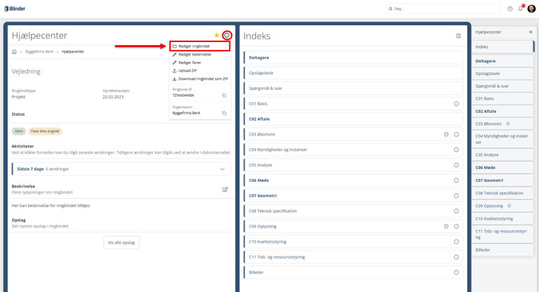 På ringbindets indeksside kan du ved at klikke på de tre små prikker, bl.a. redigere ringbindets stamoplysninger - ved at klikke på knappen "Rediger ringbindet".
