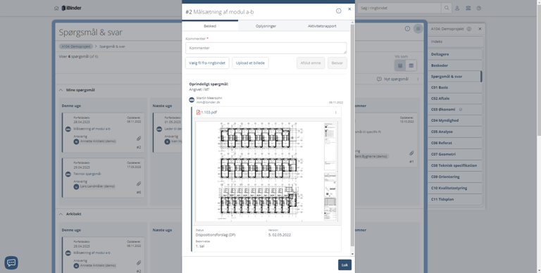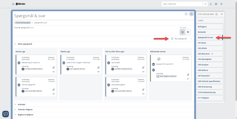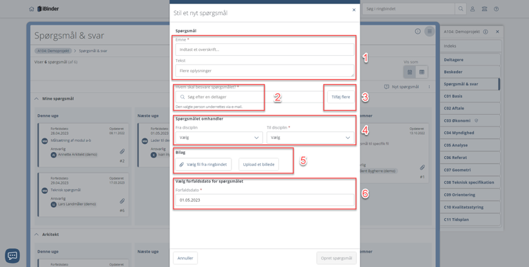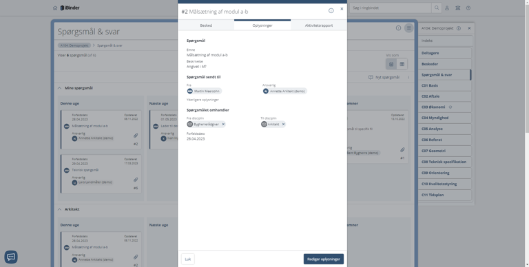 Når et spørgsmål er oprettet kategoriseres de efter fagområde, modtager og forfaldsdato. I dette tilfælde har vi stillet et spørgsmål til Annette Arkitekt, som vi ønsker svar på i denne uge.