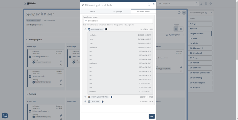 På fanen "Aktivitetsrapport", kan man på deltagerniveau, se de handlinger der er foretaget. Hver gang et spørgsmål åbnes, ændres og afsluttes bliver det logget. Er listen over deltagere lang, kan man søge på både navn og mail i søgefeltet.
