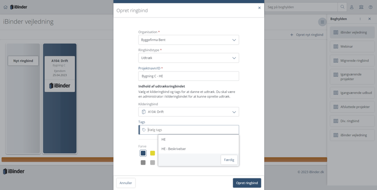 Kilderingbindet er den mappe, hvor du tidligere har tagget dokumenterne, og hvorfra du vil oprette et udtræksringbind. Klik derefter under "Tags" og vælg det eller de tag(s), som udtræksringbindet skal baseres på. Klik til sidst på "Opret ringbind".