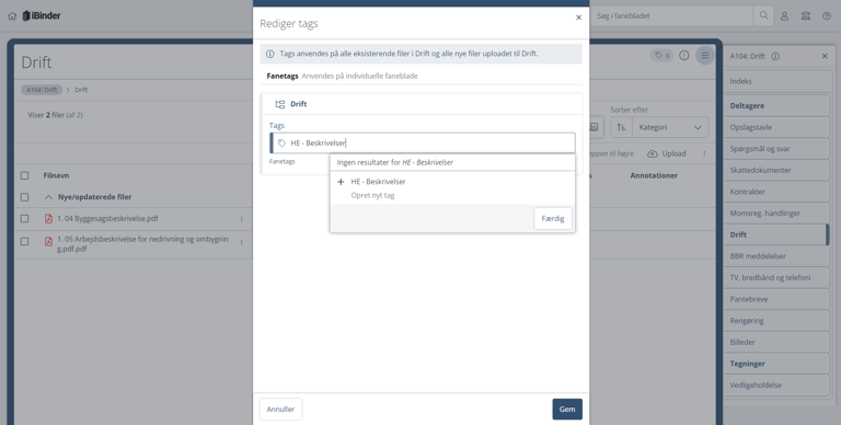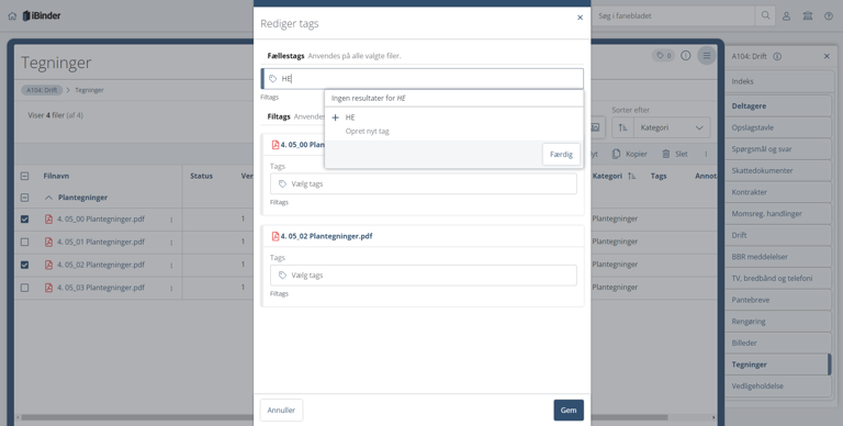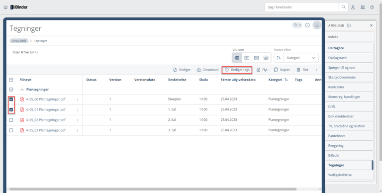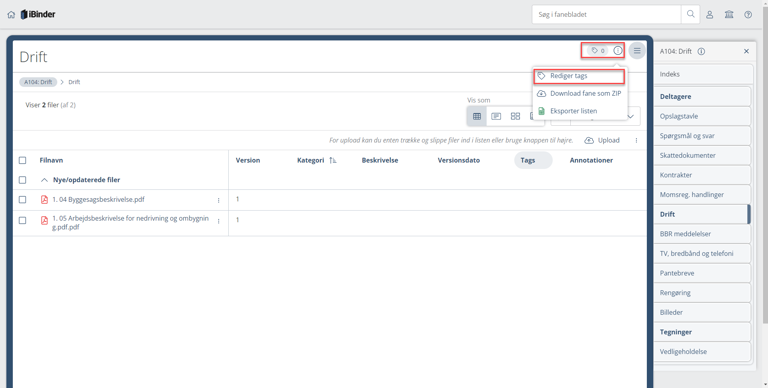 Du kan også vælge alle filer i en fane/mappe ved at klikke på "Rediger tags" til højre i mappen. Tagger man en hel fane/mappe, vil spejlingen også gælde alle fremtidige filer. Så hvis en ny fil tilføjes til en fane med et tag, vil den automatisk modtage samme tag - og blive spejlet i udtræksringbindet.