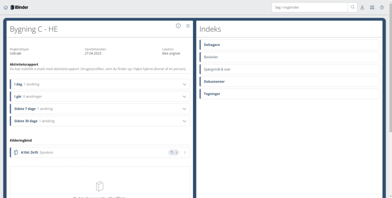 Nu er udtræksringbindet oprettet og vi befinder os på indekssiden. Ringbindets struktur er lidt det samme som i et projekt. På venstre side har du stamoplysningerne og på højre side fanerne.