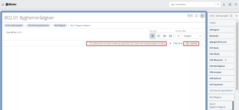 Klik ind på fanen hvor filerne skal uploades og dernæst på knappen "Upload"