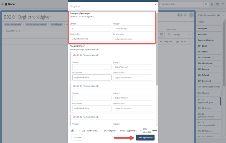 Ved upload af flere filer samtidig, kan man øverst i feltet "Gruppeoplysninger", udfylde standardinformationer, som er gældende for alle (eller majoriteten) af filerne. Dette kunne f.eks. Være kategori. Når den ønskede metadata er indtastet, skal du klikke "Gem og minimer".