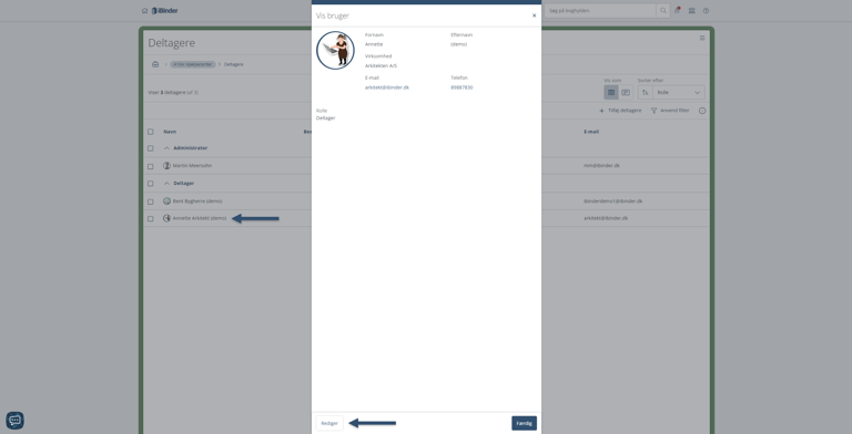 Man kan ændre beskrivelse og rettigheder på en deltager, ved først at klikke på vedkommendes navn, og dernæst på knappen "rediger".