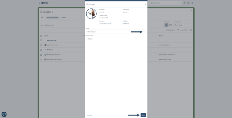 Du ændrer rettighederne ved at klikke på pilen ud for den aktuelle rolle, hvorefter dine valgmuligheder vil fremgå i drop-down-menuen. Tilføj eventuelt en beskrivelse og tryk gem.