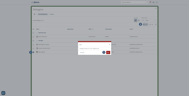 Man sletter deltagere ved at sætte et flueben til venstre for deres navn, hvorefter man klikker på "slet" i statuslinjen til højre. Ikonet dukker op, efter du har sat et flueben. Afslutningsvis trykker du "Slet" i pop-up-vinduet.