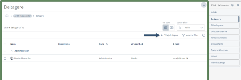 Under fanen deltagere, kan man som administrator tilføje og slette deltagere. Klik på "+ Tilføj deltagere", som befinder sig på statuslinjen, for at tilføje en deltager.