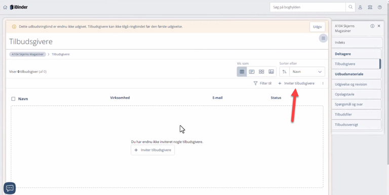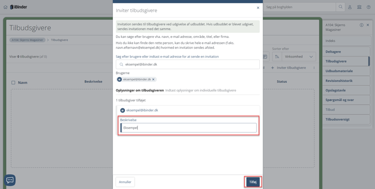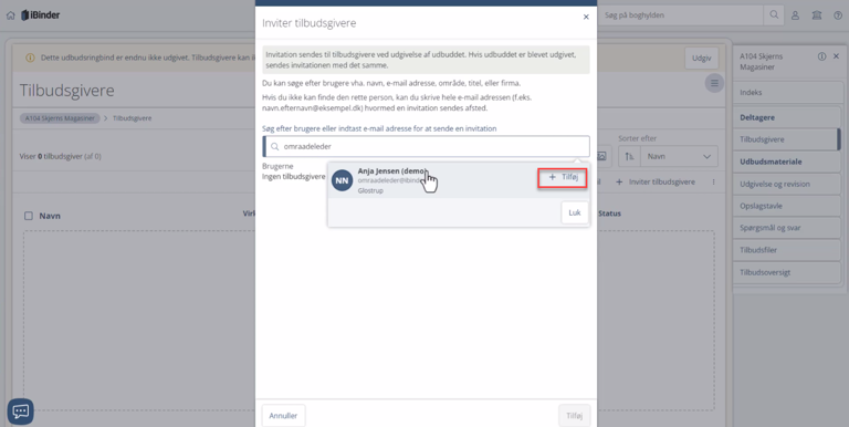 Vær opmærksom på, at invitationen først sendes til tilbudsgiverne når udbuddet er udgivet. Hvis udbuddet allerede er blevet udgivet afsendes invitationen med det samme.