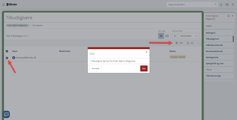 Man sletter tilbudsgivere ved at sætte et flueben til venstre for deres navn, hvorefter man klikker på "slet" i statuslinjen til højre. Ikonet dukker op, efter du har sat et flueben. Afslutningsvis trykker du "Slet" i pop-up-vinduet.