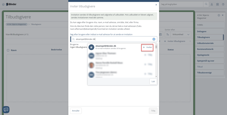 Alternativt kan man altid indtaste e-mail adressen på den pågældende person, som vil få tilsendt en invitation til oprettelse af bruger, hvis vedkommende er helt ny hos iBinder. Indtast e-mail adressen og klik på knappen "+ Inviter".
