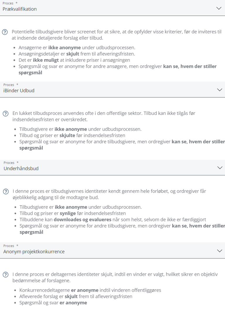 Indtast projektnavn/ID og vælg en udbudsproces i dropdown menuen. Processen du vælger har indflydelse på bl.a. terminologi, anonymisering og afleveringskrav.