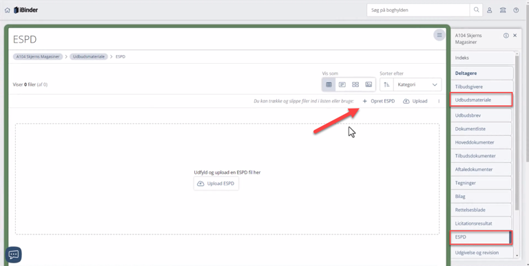 Du kan tilgå og oprette ESPD under fanen "Udbudsmateriale".