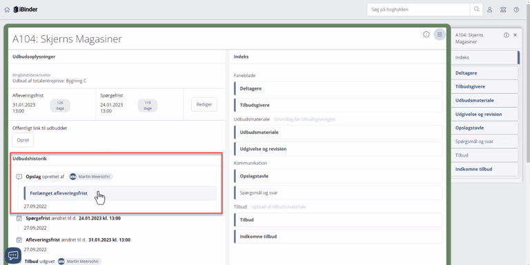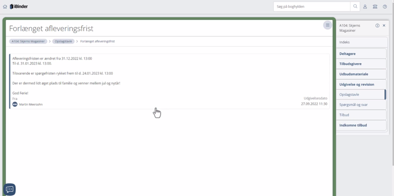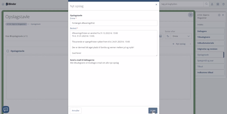 Overskriften er det eneste som vil fremgå på indekssiden under udbudshistorikken. Den fulde besked kan altid tilgås ved at klikke der, eller ved at klikke ind på beskeden her under fanen 'Opslagstavle'. Alle tilbudsgivere modtager øjeblikkeligt en e-mail når du klikker på knappen "Udgiv". Vær opmærksom på, at beskeder hverken kan slettes eller redigeres efter publicering.