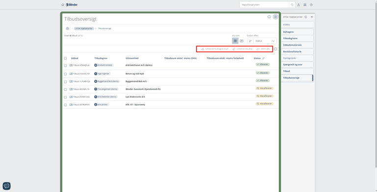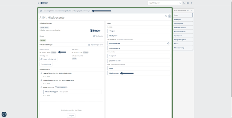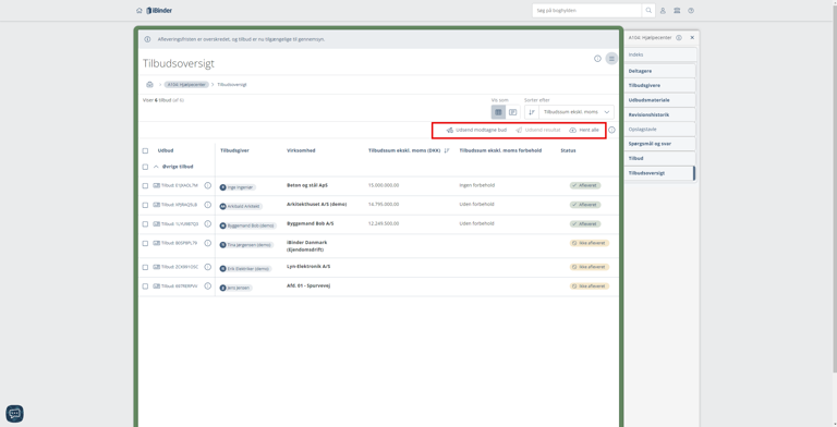 På fanen tilbudsoversigt, kan du holde styr på de bydende og deres afleveringer både før og efter fristen.