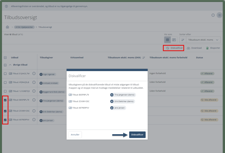 Markér en eller flere af de bydende med et flueben til venstre for deres navne og klik dernæst på "Diskvalificer". De bydende vil miste deres adgang til udbuddet og vil ikke længere blive underrettet om det videre forløb. De kan naturligvis genkvalificeres, skulle der være tale om en fejl.