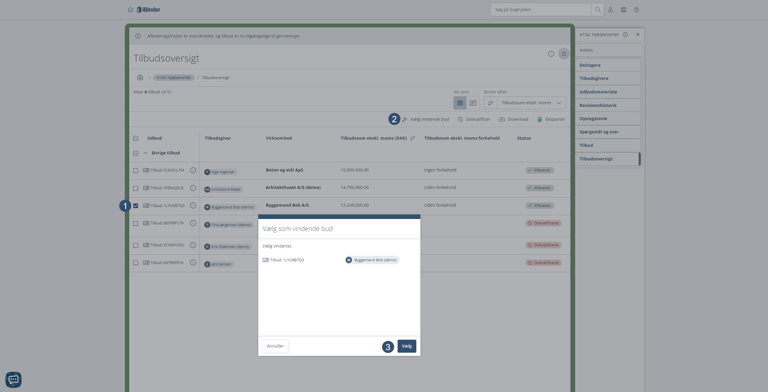 Sæt et flueben til venstre for vedkommende og klik dernæst på "Vælg vindende bud", inden du i dialog boksen klikker "Vælg". Vinderen kan stadig fravælges, frem til et resultat er udsendt. Ingen får besked om valg af finder, før der er udsendt et resultat.