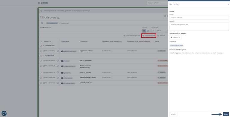 Ved at klikke på knappen "Udsend modtagne bud", kan du oprette en direkte besked til de bydende, med oplysninger om de modtagne bud. Du kan også vedhæfte en fil og tage stilling til, om deres forsidepriser skal indgå i beskeden.