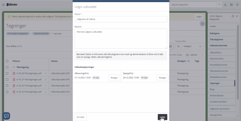 Deltagere og tilbudsgivere vil modtage en e-mail notifikation om, at udbuddet er udgivet når der klikkes på knappen "Udgiv".