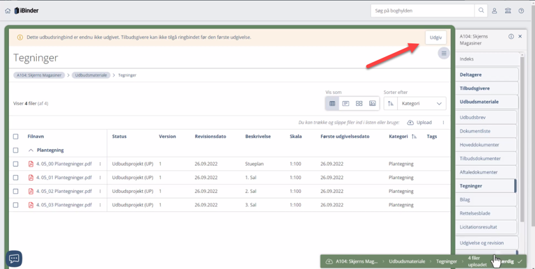 Så snart du har uploadet din første fil, vil der øverst opstå et banner med en besked om at det ikke er udgivet; såvel som en udgivelsesknap. Klik på "Udgiv" for at påbegynde udgivelsen af dit udbud, således at det bliver synligt for tilbudsgiverne.