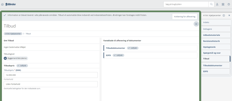 I takt med der udfyldes og uploades i de påkrævede faner og felter, vil det gule ikon hvorpå der stod "Ikke udfyldt" blive erstattet med et gråt, hvor der står "Udfyldt". Banneret er desuden ændret og informere nu om, at tilbuddet automatisk afleveres ved fristen. Der skal altså ikke aktivt klikkes på en afleveringsknap.