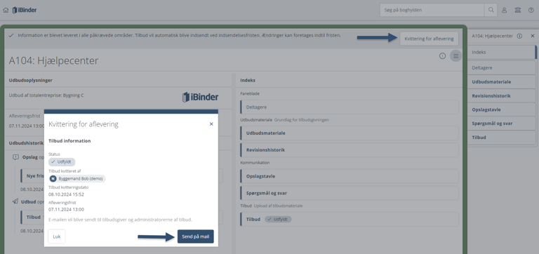 Du kan ved at klikke på "Kvittering for aflevering" rekvirere en e-mail, der lister de afleverede dokumenter til dig selv og de af dine kollegaer der har administrator rettigheder.