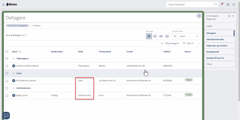 Administratorer - kan tilføje, redigere og slette deltagere, samt stille spørgsmål til udbudsmaterialet og aflevere tilbud.