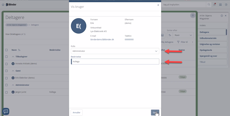 Du kan altid ændre rettigheder for en given deltager. Klik på en deltagers navn og dernæst "Rediger", for at frembringe nedenstående pop-up-vindue. Her kan du ændre rettigheder i drop-down-menuen under "Rolle" og eventuelt tilføje en beskrivelse, inden du afslutningsvis trykker "Gem".