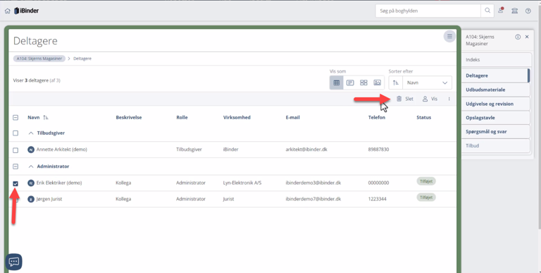 Man sletter deltagere ved først at sætte et flueben til venstre for vedkommendes navn, inden man derefter klikker på knappen "Slet".