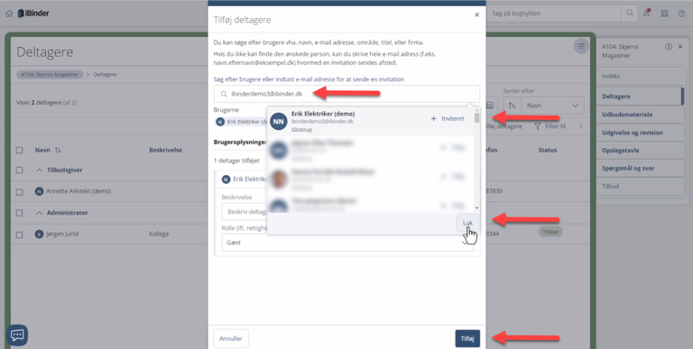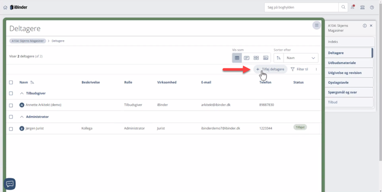 Du kan søge efter deltagere blandt eksisterende brugere i iBinder. Søg på f.eks. navn, by eller virksomhed. Finder systemet brugeren, kan du tilføje vedkommende ved at klikke på "Tilføj" efter vedkommendes navn.